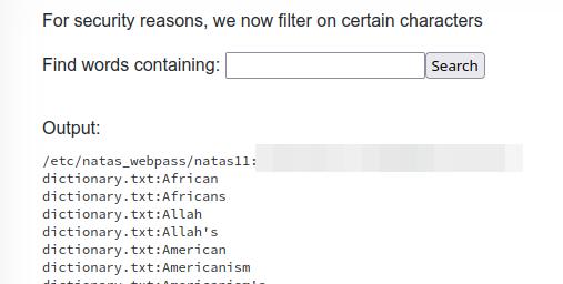 It's incredibly simple and could have been used in the previous level too. grep can take multiple files as a parameter to do its searching in. We would need to enter a single character for the search parameter for grep (and hope we get lucky) as well as the file we're also interested in, and that's the password for level 11. This search string might do the trick: a /etc/natas_webpass/natas11.
