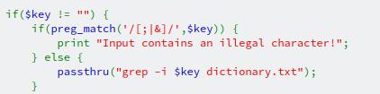 At an initial glance, we can see a regular expression is being passed into the preg_match function, and if the string contains either a ;, & or | it will trigger the error state. But what are those characters. We saw ; in the previous level as a means to separate commands. The other two are just that, a means to separate *nix commands, but they're typically used in pairs such as && or ||. So, how do we get around this check?