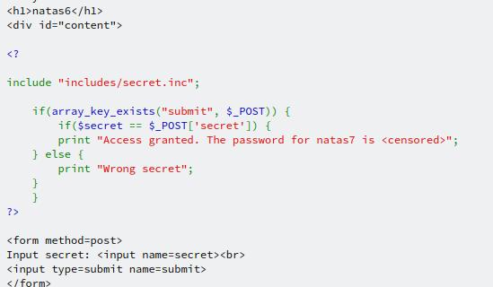Navigating to http://natas6.natas.labs.overthewire.org/includes/secret.inc, we see a blank page. Which is not unexpected seeing as this is just a file that PHP would read. Taking a look at the source for the page, we're able to see the "secret", which can be entered into the text box on the home page, which will give us the password for the next level.