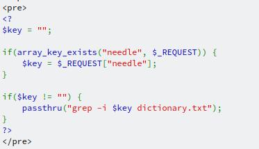 Looking at the code, we can see a couple of interesting things. The first is the passthru function, which is called searching through a text file. The second is that there doesn't seem to be any input validation (again) checking to see if what's being passed in to the function is allowed to. With this in mind, we might be able to exploit something called Command Injection, where we can insert our own commands to do more than what was initially expected. Now, what command should we try? Let's go all out and see if we can get the password for the next level, shall we?