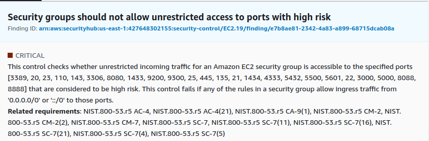 The first five findings listed as critical have the title of Security groups should not unrestricted access to ports with high risk. This is quite descriptive, and most should be able to work out this is not ideal. Basically, a security group has been configured that allows access to a high-risk service from any IP address.