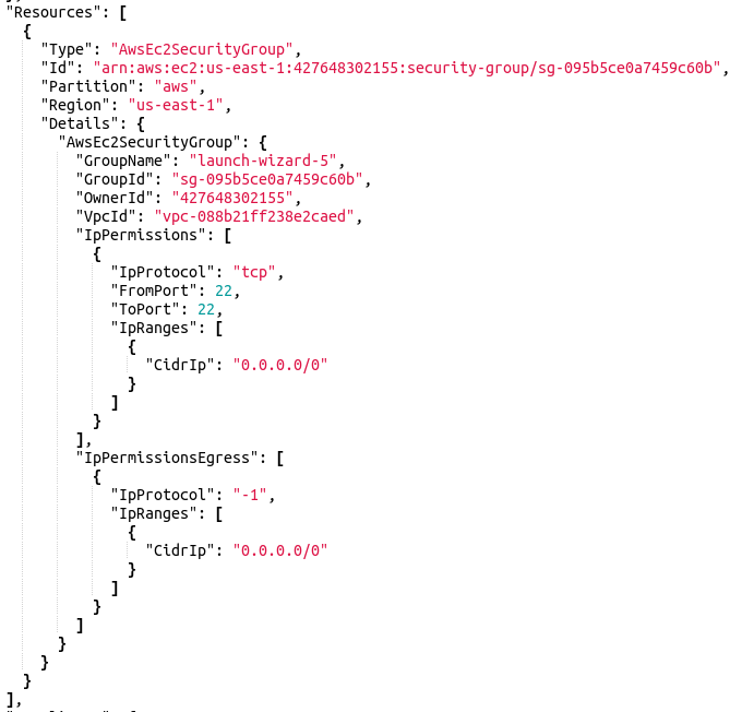 Three out of the five findings are for launch configurations which make SSH available to anyone. The resource appears to have the default name (launch-wizard-*) meaning a user may have created an EC2 instance using the launch wizard using the default settings. The details of which can be seen in the below screenshot.