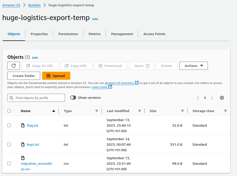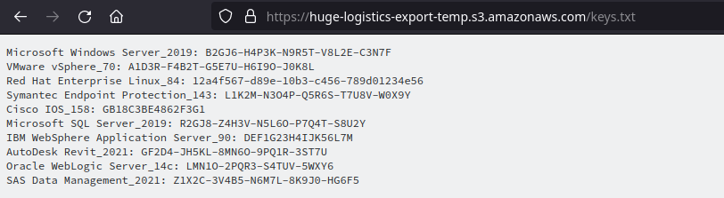 The other bucket, on the other hand, is a little more concerning. This one goes by the name huge-logistics-export-temp. This account has been given access to view the content of this bucket, and it contains a set of access keys, software licence keys, and the flag to this lab.